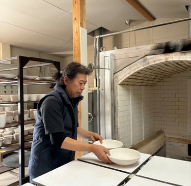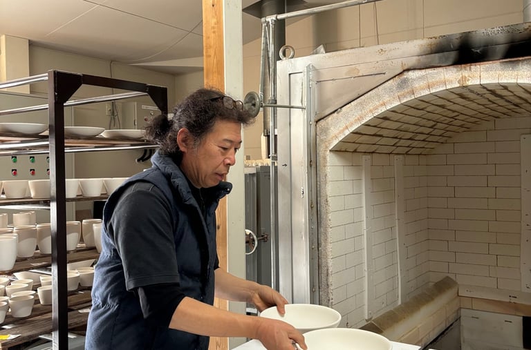 Situé à Tobe, dans la préfecture d’Ehime, l'atelier Yoshua Kōbō puise son inspiration dans un environnement naturel exceptionnel, riche en pierre à porcelaine, ingrédient clé du Tobe-yaki. Traditionnellement, cette céramique japonaise est caractérisée par un fond blanc immaculé orné de motifs bleu indigo, comme les célèbres arabesques ou motifs solaires. Yoshito respecte cet héritage tout en explorant de nouvelles formes, couleurs et finitions, offrant ainsi une vision moderne du Tobe-yaki.